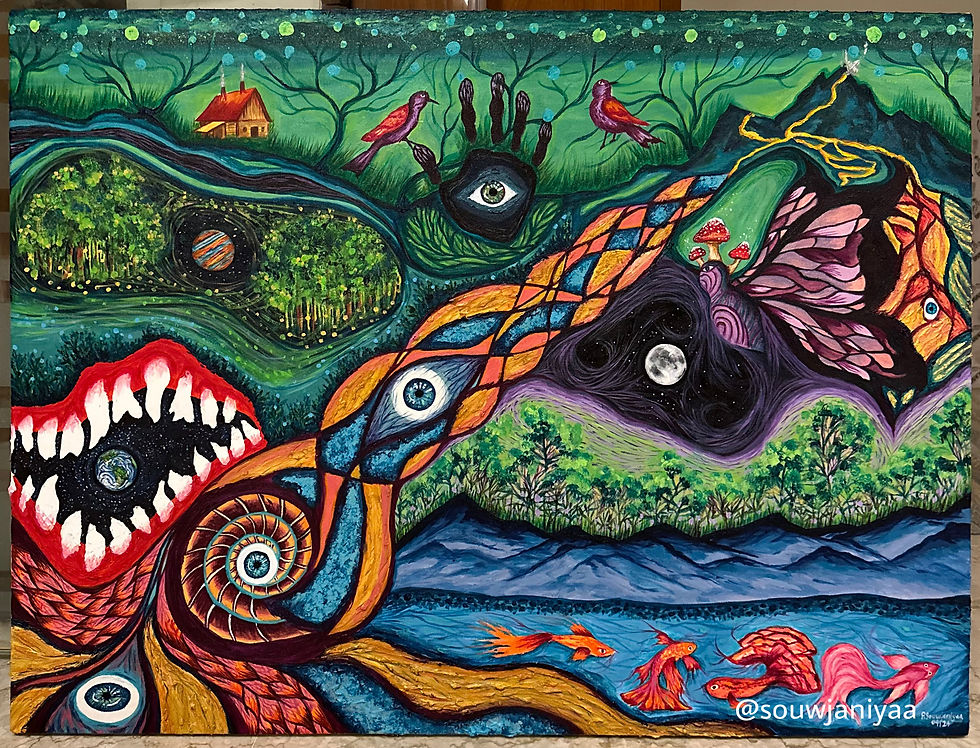 Light and dark and everything in between dancing in harmony, ceaselessly transforming into one another. Forms emerge and dissolve, memories and images flit in and out of existence. Surfing the anxious waters but also resting on the occasional calm shores, I notice, nothing is predominant, everything is in a fluid balance.